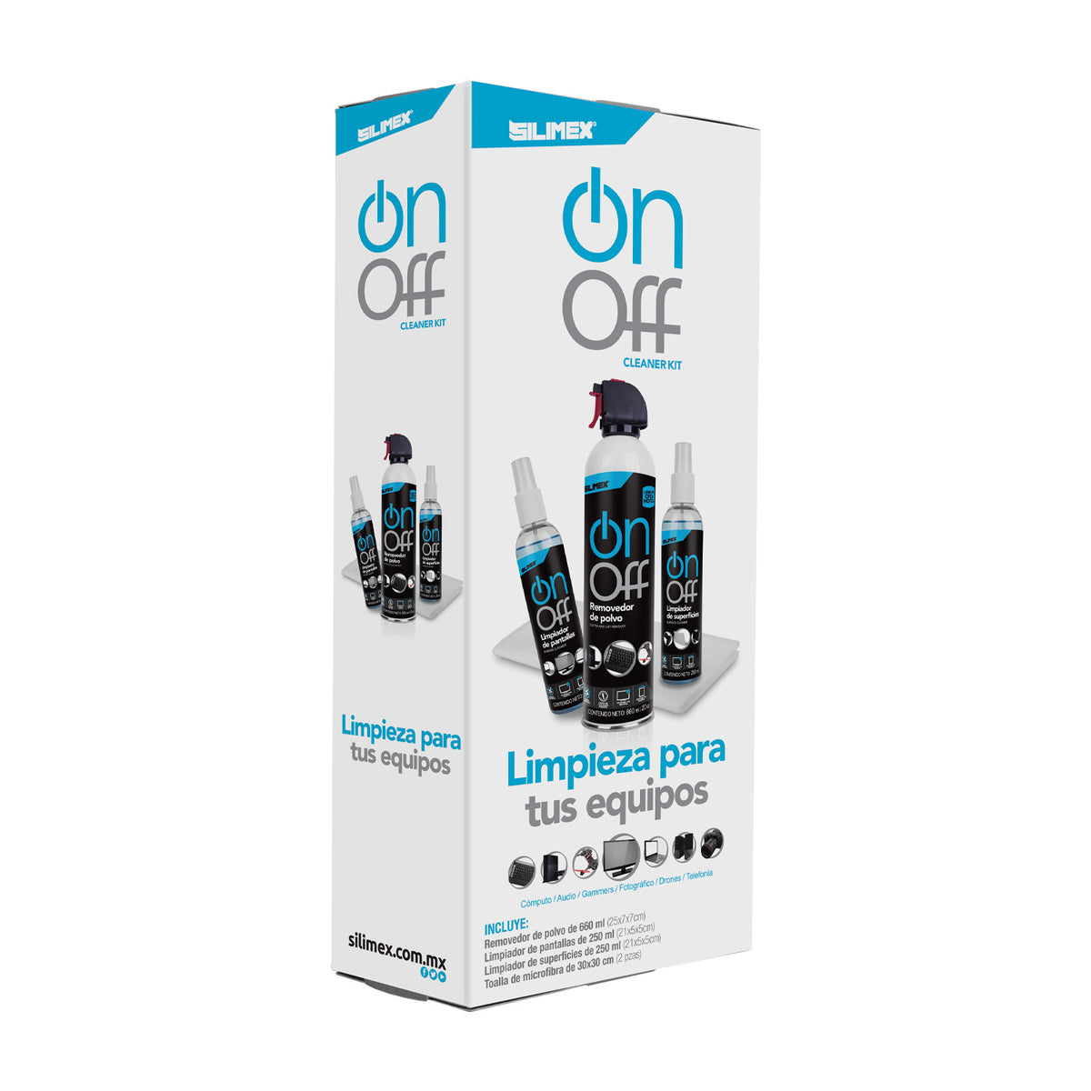KIT LIMPIEZA ON-OFF SILIMEX, Aire 660ml Locion superficies 250ml, Limpia Pantallas 250ml y 2 Microfibras