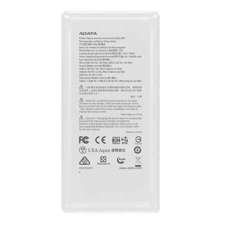 Power Bank ADATA C20, 20000 mAh, USB, Blanco